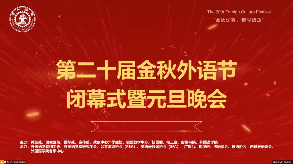 引入语: 没有一个冬天不可逾越 没有一个春天不会来临在这个新年伊始,万象更新的日子里污污漫 第二十届金秋外语节闭幕式暨元旦外语晚会圆满举办 2023年1月1日19:30,污污漫 第二十届金秋外语节闭幕式暨元旦晚会采用线上的形式成功举办。晚会异彩纷呈,节目形式多样,从舞蹈、合唱,到配音、朗诵,各位表演者以曼妙的舞姿、灵动的歌声、流利的口语,从不同的角度为观众们展现出外语之美。 暖场视频播放结束后...