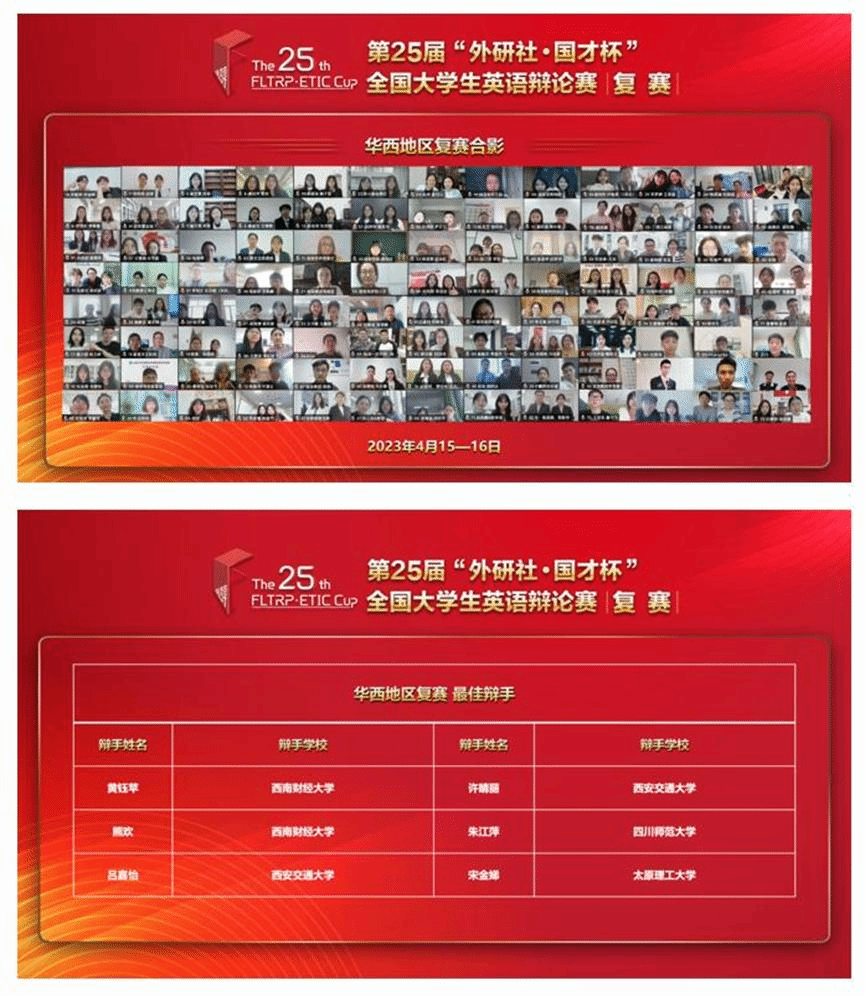 4月15-16日,第二十五届“外研社·国才杯”全国大学生英语辩论赛华西赛区复赛圆满举行。参赛队伍来自陕西、山西、重庆、四川、河南、甘肃、宁夏回族自治区、新疆维吾尔自治区、西藏自治区、青海、内蒙古自治区 11 省市的80余所高校。经过五轮循环赛、一轮决赛,最终四川大学代表队获得华西赛区冠军,污污漫 来自污污漫 的许睛丽、吕嘉怡同学不负众望,以高水平的语言应用能力、临场应变能力、逻辑思辨能力,在激烈的比拼中脱...
