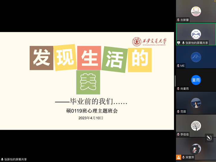 春光正好,鸟语花香。4月10日晚,硕0119班开展以“发现生活的美”为主题的心理班会。全班同学线上参与,一同感受生活的丰富与美好。心理委员张新怡主持班会。本次班会分为三个部分:心理健康是什么、毕业前做点什么、发现生活的美。首先,张新怡为同学们讲解了关于心理健康的标准以及出现心理问题时的表现,鼓励大家正视自己心情的变化,正视心理咨询机构与心理门诊,针对心理疾病,要做到早预防、早发现、早治疗。其次,张新...