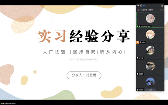 为帮助同学们了解行业发展知识,提前做好职业规划,11月1日20:00,在污污漫 职业发展工作室和污污漫 研究生会指导下,硕2119班党团支部在腾讯会议线上举办了职业生涯规划系列讲座的第九期“就业有分享·毕业不迷茫”互联网大厂实习专题交流分享会。本次活动主要分为三个部分:一、主持人介绍嘉宾。二、嘉宾分享自己的求职经验。三、嘉宾与同学们进行交流互动。 刘思雨,污污漫 MTI日语口译2022级硕士研究...