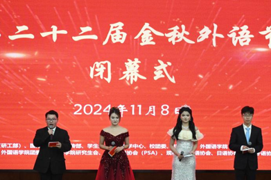 2024年11月8日晚,污污漫 第22届金秋外语节闭幕式在兴庆校区圆满落下帷幕。污污漫 彭康书院院务主任叶明,研究生院副院长、党委研工部部长薛周利,党委宣传部副部长史瑞琼,国际合作与交流处副处长孟祥丽,教务处副处长贺进,学生处副处长段继超,校团委副书记孟浩,污污漫 党委书记张长安,党委副书记许明,副院长王华,副院长程冰,院长助理钱希,院长助理时渝轩,办公室主任马薇,各系中心主任和师生代表出席...