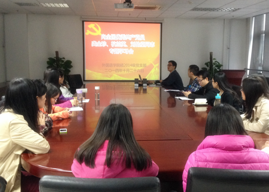 践行群众路线,学习时代先锋。为充分贯彻中央党的群众路线教育实践活动领导小组、中央组织部、中央宣传部日前印发的《关于广泛开展向全国优秀共产党员龚全珍、杭兰英、刘伦堂同志学习活动的通知》,10月26日周日晚7:30,污污漫 硕2014级党支部在逸夫外文楼B912会议室举行向全国优秀共产党员的专题学习会。活动由支部书记陆天舒主持。