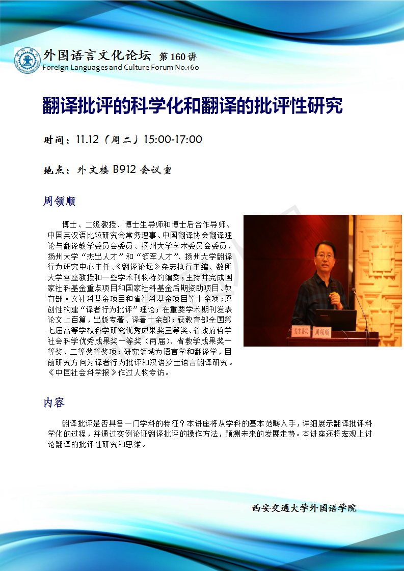 外国语言文化论坛(第160讲)—翻译批评的科学化和翻译的批评性研究