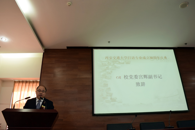 庆典活动上校党委副书记宫辉博士对30年来日语系取得的成绩表示肯定,他指出,通过这次庆典,我们不但要总结纪念过去,更要规划展望未来。宫副书记通过自己亲身经历和体验,语重心长地告诉我们“多学一门语言,就能多一个视角看世界”,我们的彭康校长就精通英语、日语、德语、意大利、俄语等多种语言,所以他看世界的视角和高度就比我们要宽阔和高远得多。他对日语系以后的发展提出了四点建议:第一、加强国别的研究,为国家发展尽我们的绵薄之力;第二、加强社会文化研究,争做民间文化交流的使者;第三、加强日语学习和日语教育的研究,胜任文化语言传播使者的使命;第四、在中日交流中主动发声,在社会上倡导一种客观、公正、理性的观念来处理中日关系。同时宫辉副书记代表学校表达了对日语系的期望:希望日语系在未来学校的学科发展尤其是大文科的学科发展中能够大有作为。