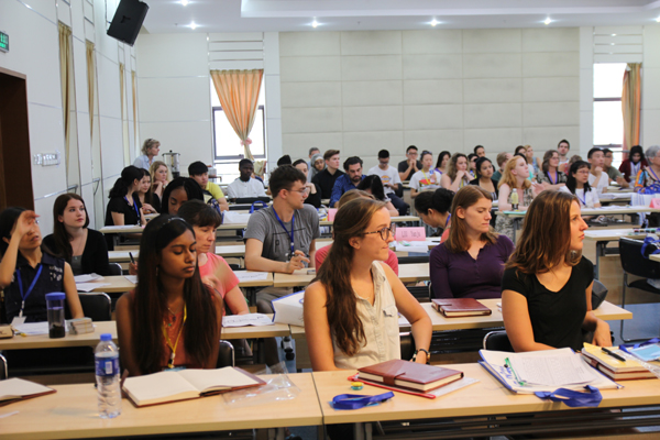 在逸夫外文楼十楼会议厅举行2014-2015学年小学期英语实践项目(2015 Summer Program)中方老师和外方嘉宾、实习生见面会。包括外语学院中方老师们以及来自世界各地的嘉宾(guest speakers)、实习生(interns)在内的一百多人在会议厅济济一堂,拉开了本学年度小学期的序幕。外语学院院长陈向京、大学英语教学中心主任王芳、副主任刘浩、司选海以及外籍顾问Anne Bliss教授在主席台就坐。见面会由大学英语教学中心副主任许明老师主持。