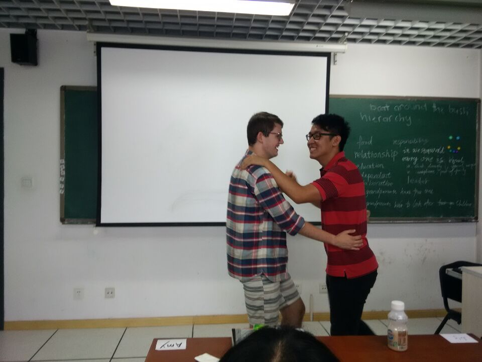 如果说Larson是标准的高冷帅哥,那么澳大利亚小伙Jerome一定是那个每个女孩心中的邻家大男孩。Jerome有个外号是“Romeo”,虽然这是隔壁班的嘉宾起的,他本人也正是我们心中最有才气的罗密欧。Jerome没有Larson那么老成,可也正因此,Jerome组织的英语实践活动让人多了一些亲切感。在我们发呆迷惑时,他会耐心解释,睿智地解决我们的问题;在我们偶尔瞌睡打盹时,他会轻轻走到我们身边,用他最温柔的声音提醒我们打起精神;在我们灰心丧气时,他会用他最温暖的笑容鼓励我们。他是我们的老师,教我们如何正确发音,带我们领略澳大利亚的风土人情,用幽默诙谐的方式让我们融入活动爱上英语;他也是我们的朋友,和我们一起捧腹大笑,和我们一同载歌载舞,细心倾听我们讲述的故事。Jerome组织的活动,我从来都不会担心走神。他像是自带着光环,我们的视线一刻也不会离开他。Jerome从不对任何学生发怒,他的脸上始终充满着笑容。在上课前一秒,他也许还是疲惫不堪,只要上课铃声响起,他依旧活力四射。有次上课,为了活跃气氛,他不仅给我们简单讲解跳舞的礼节,还现场请同学跳了一曲,让我们大开眼界。闲聊时我们口中蹦出各种稀奇古怪的中式英语,他也都能听懂,还会告诉我们正确的英语表达。