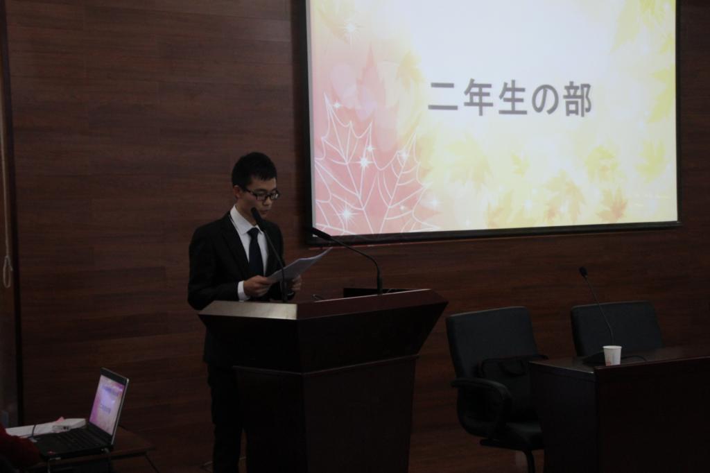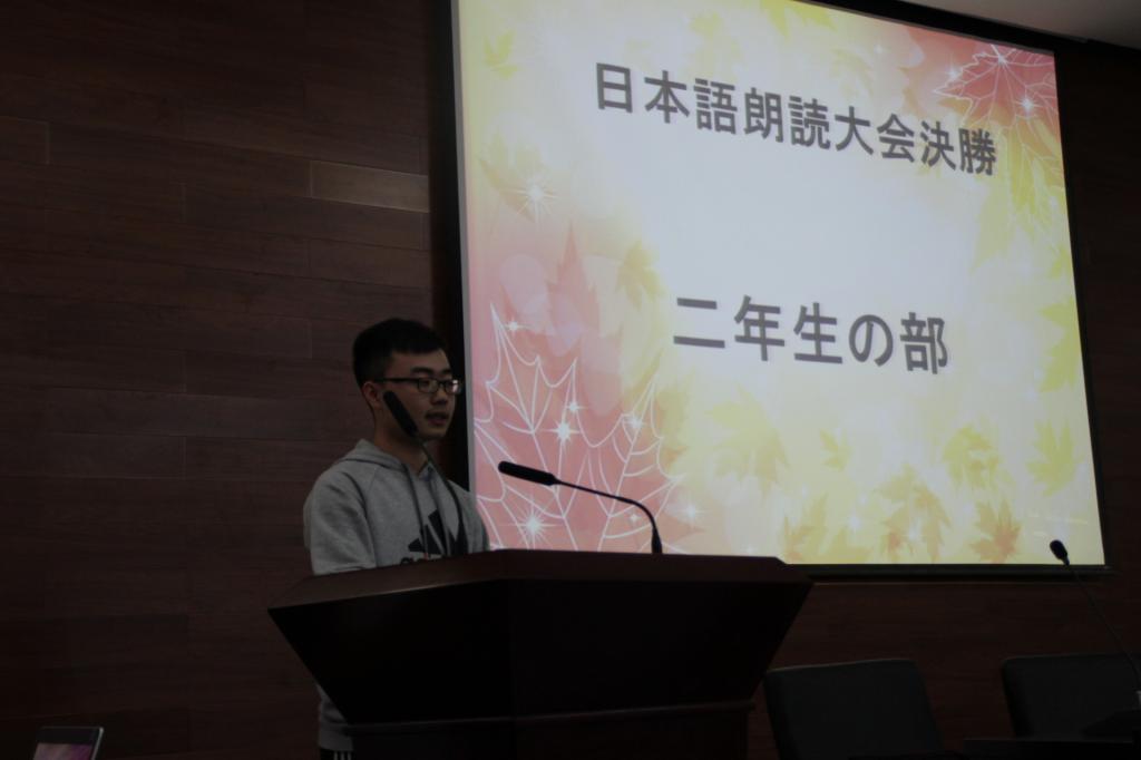 比赛由一二年级的朗读比赛以及二年级学生的演剧构成。一年级共十名同学参加朗读比赛的决赛,难得的是初学日语的他们全部朗诵的题材都是诗歌,诗歌多使用书面用语,并且有很多的古语残留,这对于一年级的同学来说很有挑战难度。然而,一年级的同学们表现极其出色。不论是对语音语调的掌握,还是对诗词内涵的诠释,无不令在场的观众鼓掌叫好。