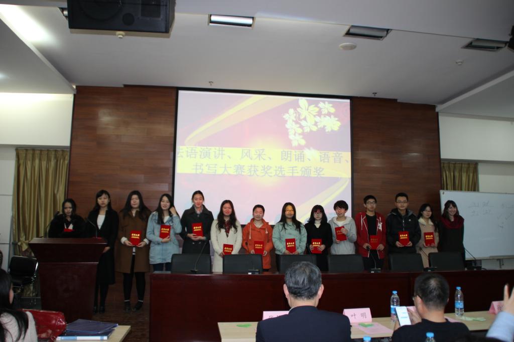 到场嘉宾分别为英语演讲比赛、英语阅读比赛、英语写作比赛、英语辩论赛、英语口译大赛、笔译大赛,俄语写作大赛,德语朗诵比赛、德语演讲比赛,日语朗诵大赛、日语写作大赛,法语风采大赛、法语演讲大赛、法语朗诵比赛、法语语音比赛、法语书写比赛,外文电影配音大赛颁奖。颁奖仪式中间穿插了获奖选手表演,优美的英文朗诵《When you are old》《Facing the sea with spring blossoms》,俄语歌曲《我们祝你幸福》、德语朗诵《大地是多么美丽》,二胡演奏《赛马》、法语歌曲《致青春》,外文电影配音《歌舞青春》和英文歌曲《The heart wants it wants》等。