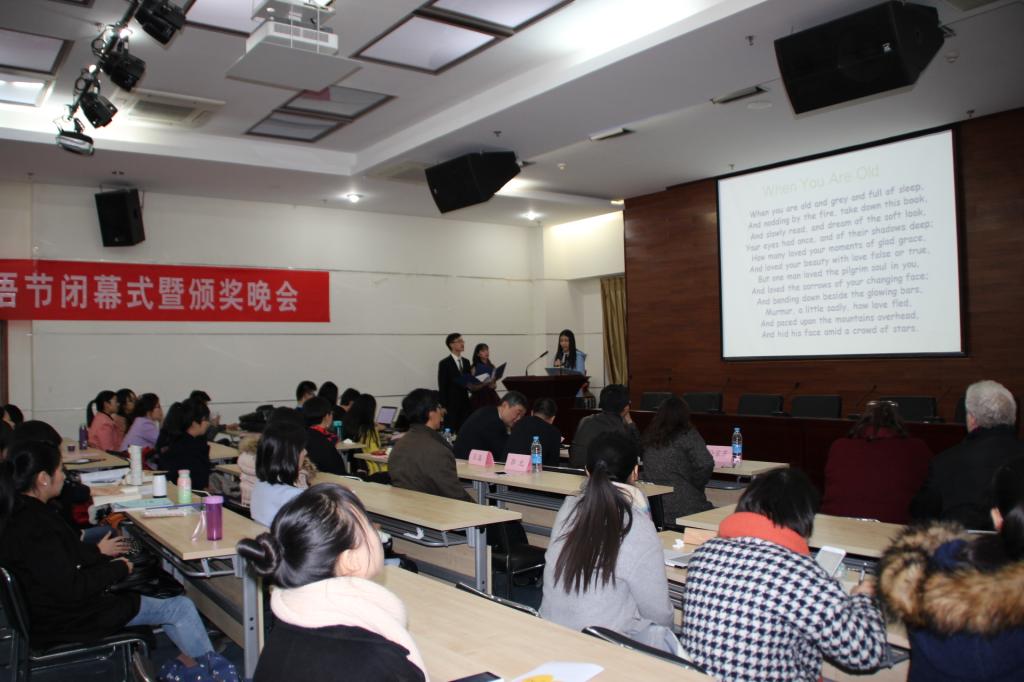 各项比赛回顾视频带大家回首了第十三届金秋外语节的整个历程。之后,闭幕式正式拉开帷幕,首先由叶明老师致辞,他说道,“金秋”是收获的季节,外语节在秋高气爽的时节开幕,见证了大家的勤奋努力和累累硕果,他希望金秋外语节能吸引更多的同学积极参加,给大家提供一个检验知识水平、展示学习成果、欣赏才艺的平台,打造成校园中一道富有异域风采和特色的亮丽风景线,也相信学校将不断给予更大的支持、关注,使金秋外语节影响更大、范围更广。