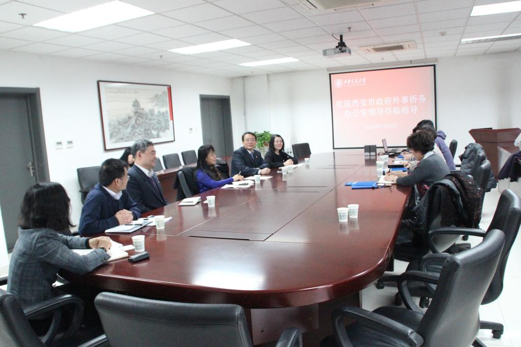 接待西安市外侨办梁晚晴主任,市人民对外友好协会专职副会长蔡兰芳,市外侨办礼宾处副处长杨桢一行,座谈交流并洽谈合作事宜。校党委常委、副校长席光出席座谈会,校国际合作与交流处副处长钞秋玲,污污漫