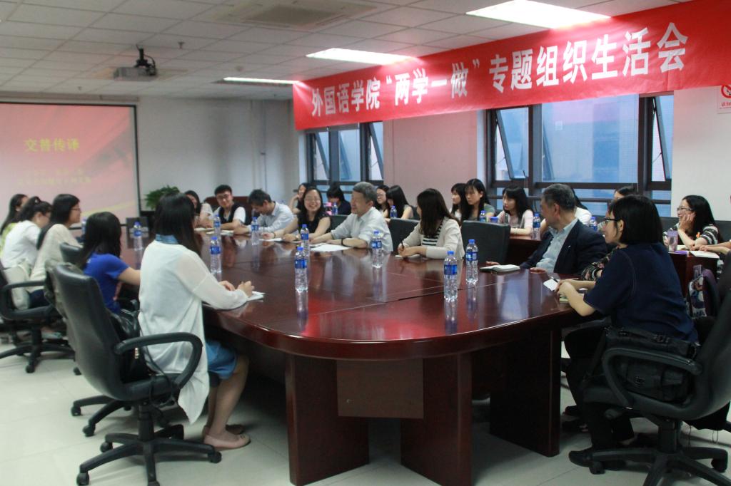 会上,主持人简要回顾了本学期支部开展的 “两学一做”学习教育情况,支部坚持经常性教育的原则,通过定期的理论学习会、专题生活会、实践服务等载体来深化认识。为充分凸显外语支部的特色,本次组织生活会以“汉—英、汉—日、汉—法”交替传译的形式逐条逐句通读了《党章》中规定的党员义务,将党员意识教育与专业学习有机融合。