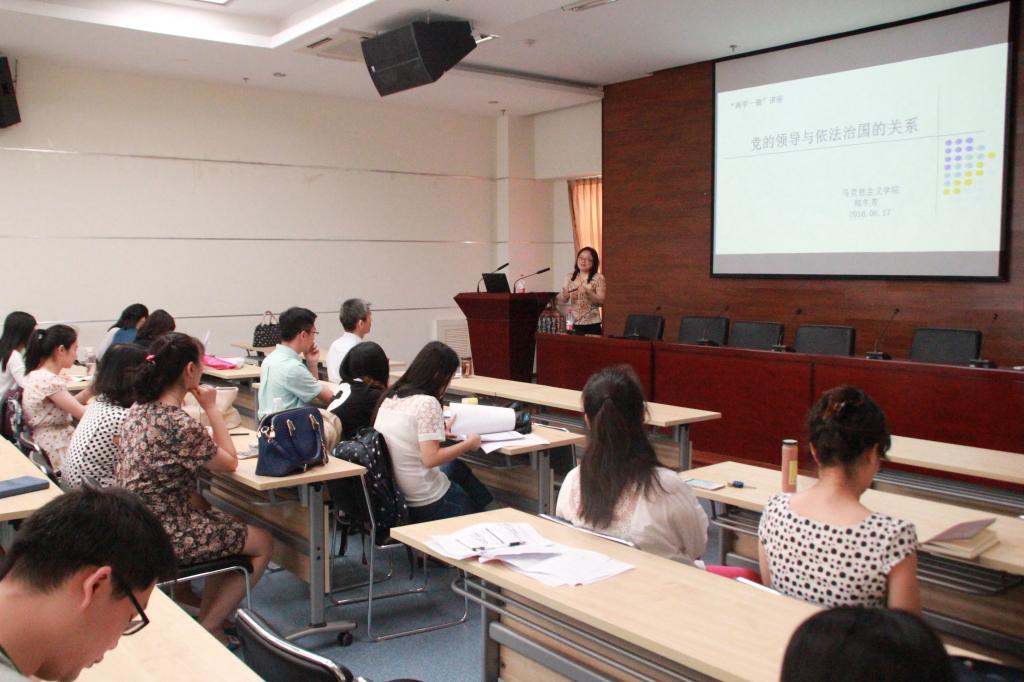 少年班选拔考试等生动案例及社会关注热点出发,围绕“党的领导与依法治国的关系”这一主题,通过习近平总书记系列讲话精神的学习和领会,阐释了宪法是国家的根本大法,依法治国首先要依宪治国的观点。郑冬芳教授从立宪、国民主权、公民基本权利保障、代议民主与普选、权力依宪法划分、司法独立、宪法监督或违宪审查等几方面讲解了宪政思潮的主要观点并介绍了宪政派、反宪政派以及社会主义宪政派等派系的不同主张。通过认真学习和解读党的十八届四中全会《决定》,郑冬芳教授从本质特征、基本经验、根本要求、相互关系、依法执政以及党与法高度统一的顶层设计等方面详细深刻地分析了党与法的关系。最后,郑冬芳教授表示,中国共产党为工人阶级和最广大人民群众谋福利,全面推进依法治国和搞好党的建设相辅相成,每个党政组织和领导干部必须服从和遵守宪法法律,不能出现以权压法、徇私枉法的情况。