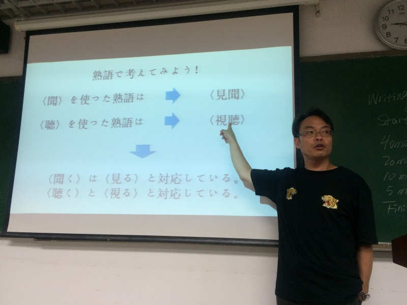 本次是由山本幸正老师带来的关于日本文化的专题讲座。讲座由这一个日语词汇展开,山本老师向同学们提出问题:这一日语词汇有什么含义?同学们纷纷积极回答,之后山本老师继续讲解在日语词汇中的两个关于“听”的词汇,提出无意识的主体无法控制的“听”与有意识的主体可控的“听”的区别。在讲解的同时,山本老师指出,关于这两个词汇的辨析源于他自身的理解和感悟,希望同学们在今后的学习之中应该抱着一种质疑的精神去学习,自主思考,主动思考。