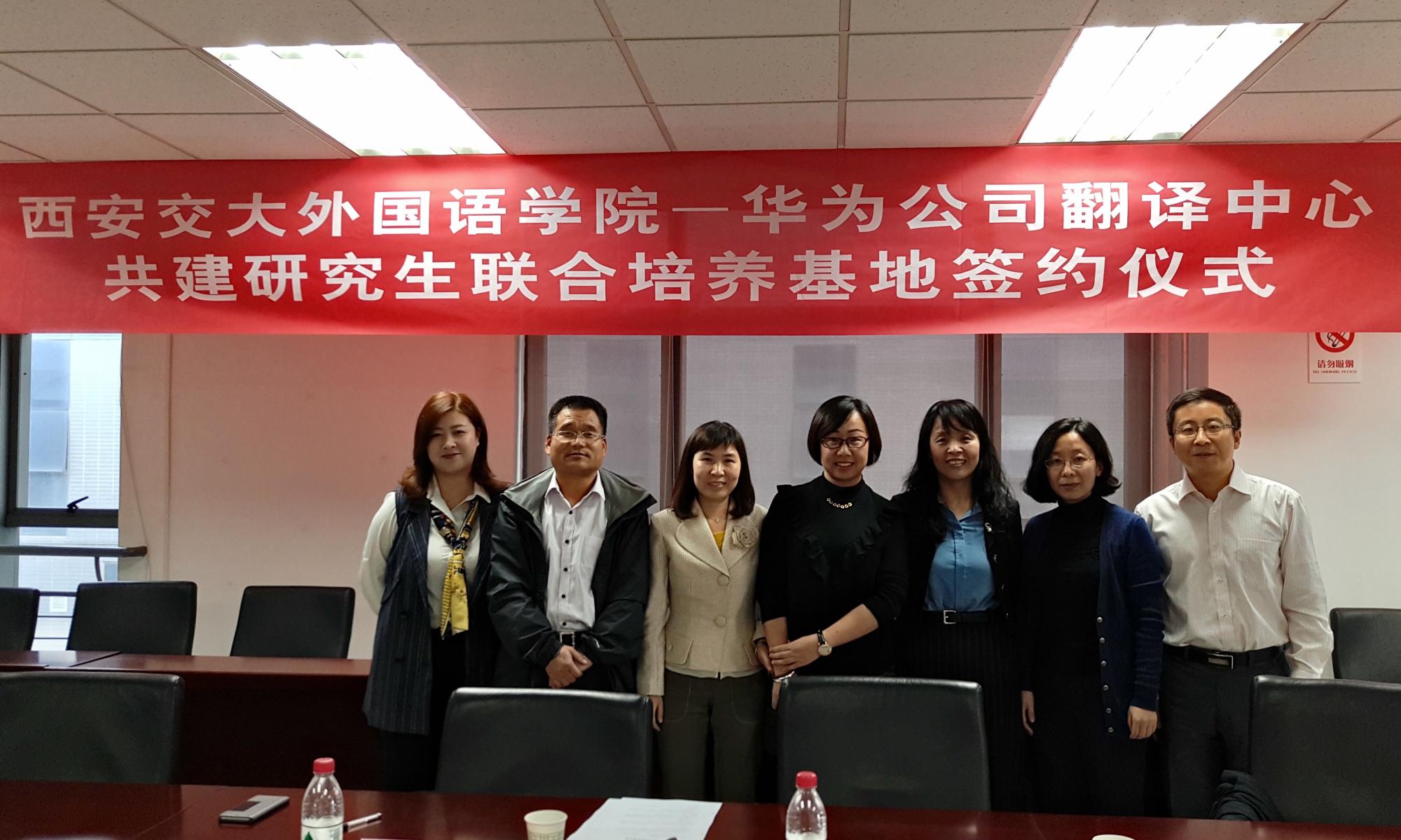陈向京院长与华为(西安)翻译中心王丽娟主任共同在合作协议上签字,参加签字仪式的有:华为(西安)翻译中心项目部主管王元经理、污污漫