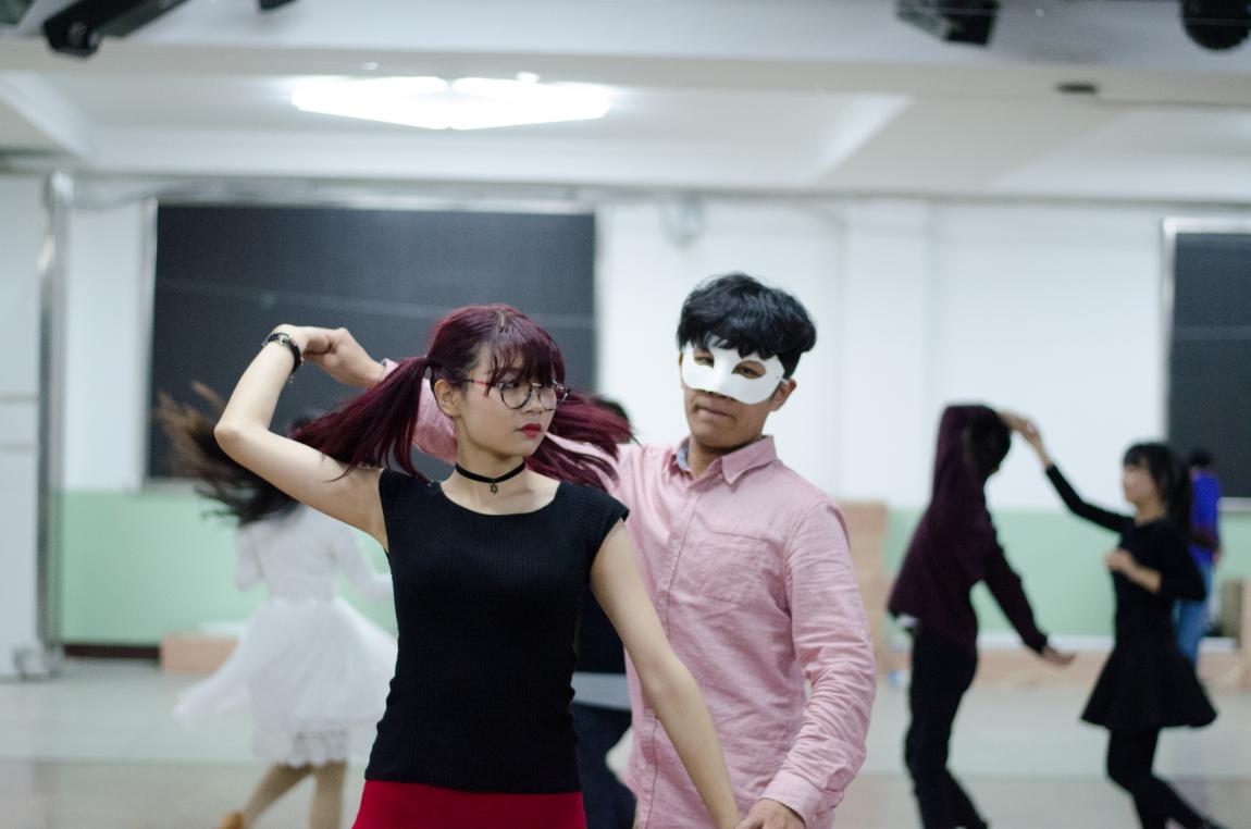 本次舞会的开场舞是由校外社团古都ALD应援团带来的wota艺表演。Wota艺是一种支持者表演的舞蹈或打气动作,也可以跟着音乐进行,其中包括跳跃,拍掌,挥动手臂和有节奏的喊口号,热场效果非常好。在热烈的音乐声中,舞者们在黑暗中激情洋溢地挥舞着荧光棒,瞬间引燃了现场气氛。黑暗中的流光溢彩也将万圣节的主题体现得淋漓尽致。
