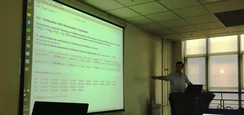 当天下午的工作坊上,de la Torre教授及其来自西班牙的访问学者Miguel Angel Sorrel Lujan博士为全体参加人员演示了如何用R软件实践操作G-DINA软件包。他们由浅入深,带领大家一步一步的使用G-DINA软件包来实现诊断学生知识技能的掌握情况,模型比较,Q-矩阵验证等功能,并且向大家展示了如何解读数据分析结果。De la Torre教授在教育测量领域贡献突出,他这次的讲座和workshop,为交大师生打开了新的思路,提供了新的研究方向和研究方法。
