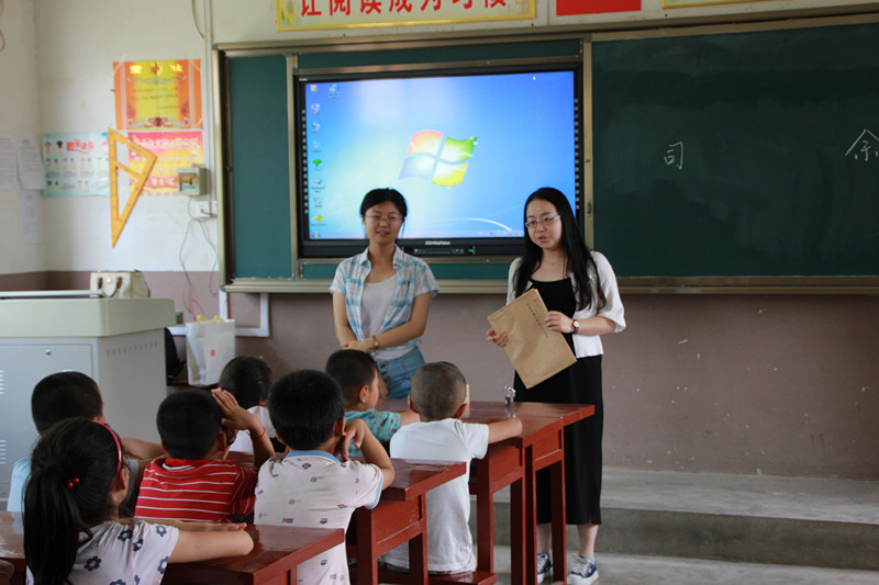 的师生与孩子们开展了一系列互动交流。研究生党员司勤冕、余碧燕面向一至三年级学生,讲授了地理、物理、历史、文学、生物等各方面的知识,并适时进行了英文教学。赵雅莹和刘晓晓两位研究生党员面向四至六年级,讲授了中国地理与文化。虽然刚开始,讲课的几位研究生党员都有些紧张,但是孩子们的热情与配合给了几位“支教老师”莫大的鼓舞,课堂气氛越来越活跃。四位研究生利用提前准备好的文字、图片等讲解材料以及糖果等小礼物与孩子们进行了充分的互动,课堂教学顺利进行,小孩子们非常开心地学到了许多知识。教学活动结束后,污污漫