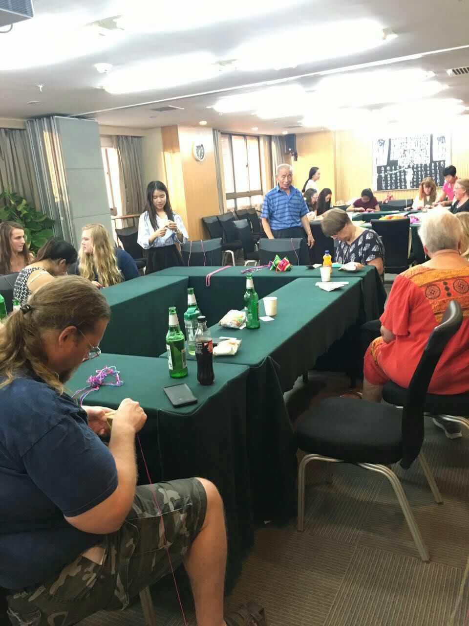 六月的最后一个夜晚,在馨乐亭酒店的会议室里举行了小型的中国民间艺术交流会,由编制中国结、制作剪纸、香包、棉絮画的民间艺人们向参加夏季小学期英语实践项目的外籍嘉宾们展示中国传统的民间艺术;本项目的实习生、志愿者等5人作为翻译, 成为艺人们与外籍嘉宾沟通的桥梁 。本次活动到场的嘉宾约有30名,他们对中国传统的手工艺文化充满了兴趣。