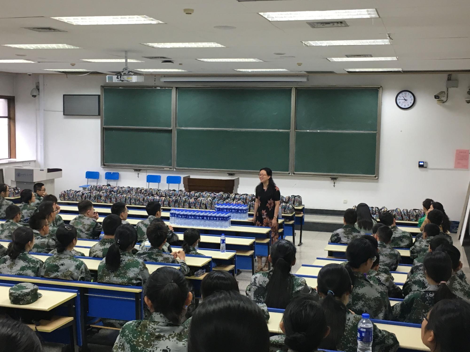 许明老师代表学院讲话。她首先对几位教官和指导员赵欣老师的精心施教表示感谢,对同学们的到来表示欢迎;她希望同学们继承军训中培养起来的优秀作风和品质,将其带到未来的学习和生活中;她鼓励同学们只要足够努力,一定会足够优秀,学校为大家提供了广阔的平台。