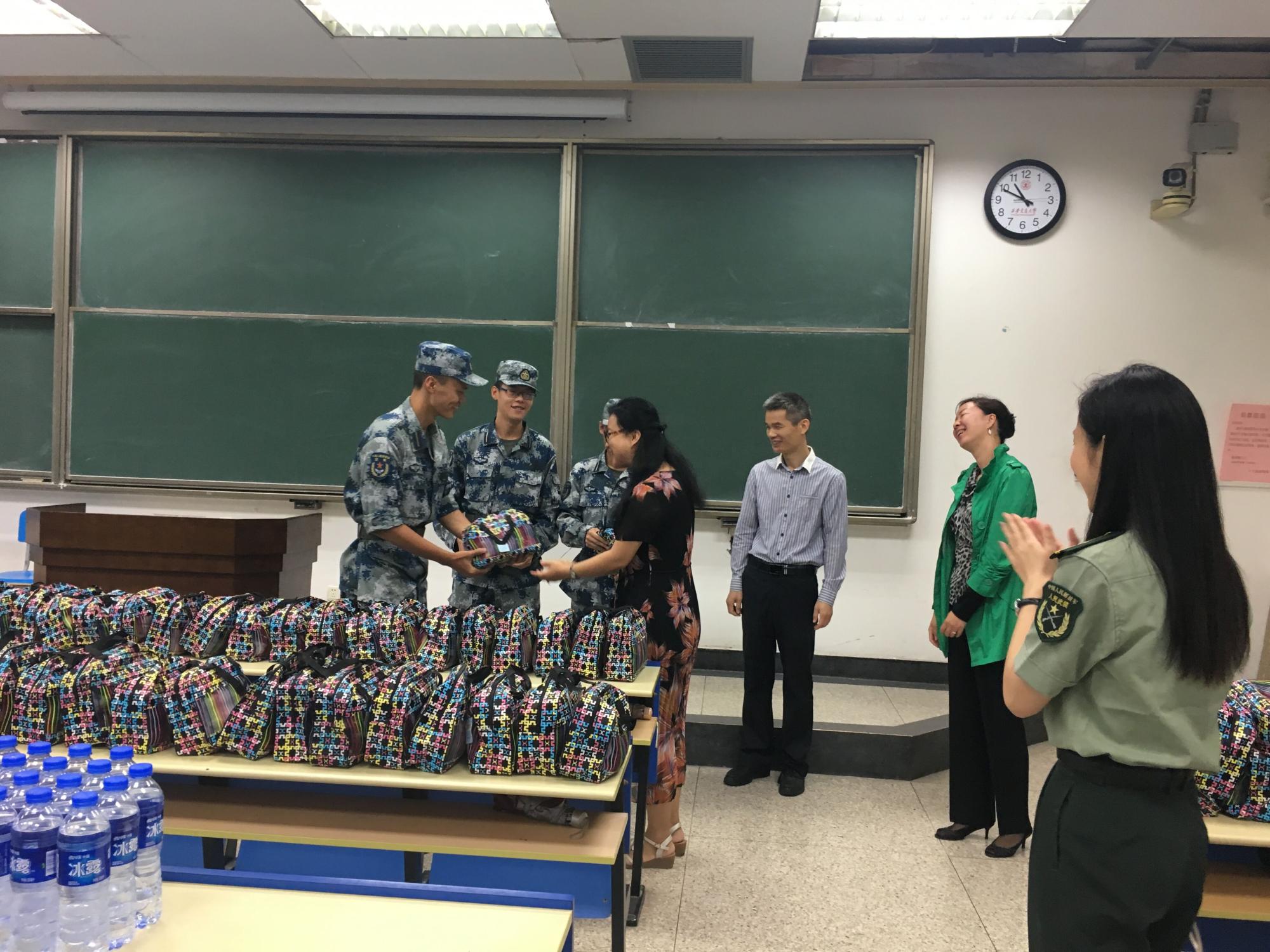 学院领导老师为军训教官和指导员发放慰问品,随后逐一为每位学生发放慰问品。