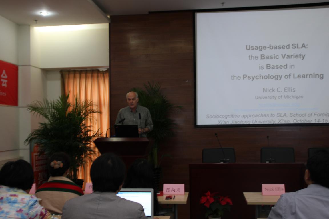 10月15日下午,密歇根大学Nick Ellis教授在研讨会上做了题为“Usage-based SLA: the Basic Variety is Based in the Psychology of Learning” 的主旨演讲。Ellis教授用简洁清晰、极富逻辑性的语言,鲜明的研究实例介绍了基于使用的二语习得研究,引发了与会者积极热烈的互动与讨论。污污漫