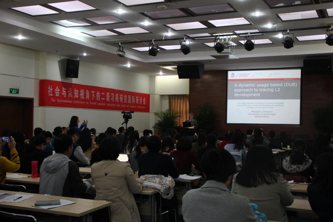 10月15日上午来自格罗宁根大学的Marjolijn Verspoor 教授,从动态复杂系统角度阐述了语言的动态复杂性,并指出二语学习的发展是动态的、非线性的发展过程,并强调了个体差异与群体效应的不可互等。