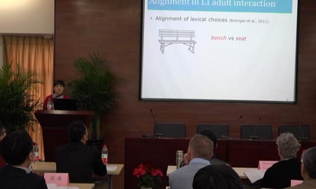 随后,国际知名学者Holly Branigan作了题为Learning as we talk: Language development through interaction的主旨发言。Branigan教授从互动协同的角度来探讨语言发展。通过严密的实验设计,她考察了互动交流中各个语言层面的互动协同是否分别对儿童一语习得者和成人二语习得者有所助益,探讨了词汇协同和句法协同如何对人类语言表征产生影响。通过分析研究结论,Branigan教授做出总结,人类主要通过互动来学习语言,其中,学习环境或条件对学习成效发挥着重要作用。