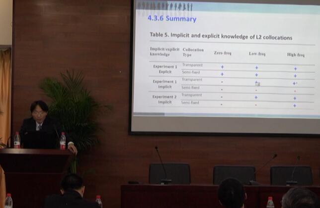 主旨发言第一部分,卫乃兴教授简要阐述了基于语料库的二语学习研究的主要范式变化。主要介绍了基于语料库的中介语对比分析模型、二语写作的元话语模型和认知语言学中的机遇用法模型。主旨发言第二部分,陆军教授展示了一个基于语料库分析二语学习者的隐性和显性的搭配知识的特点的实证研究。主旨发言从理论到研究实践,从宏观到微观,向与会者展示了基于语料库的二语习得研究的整体概况。