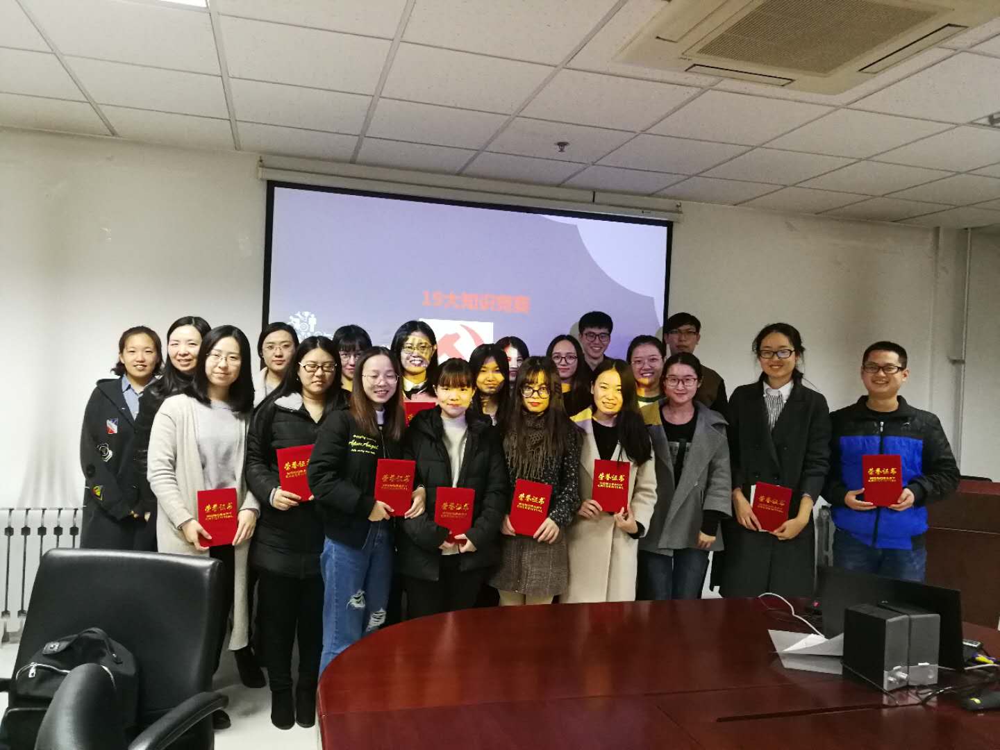 本次十九大知识竞赛分必答、抢答、风险答题三个环节,比赛现场气氛热烈。必答题环节各队选手平分秋色。随着抢答题环节的到来,每队得分不断刷新,比赛进入白热化状态。各参赛队伍都想勇拔头筹。他们的表现让裁判组和观众由衷赞叹。选手们正确无误、条理清楚地回答出高难度的问题,现场自发地响起了雷鸣般的掌声。到了风险答题环节,选手们的精彩表现,也使得现场掌声不断。经过激烈角逐,学术研究生脱颖而出获得一等奖,英语专硕学生获得二等奖,其余两组同学获三等奖。比赛结束后,辅导员马薇老师为同学们颁发获奖证书,对同学们的表现表示肯定,鼓励同学们通过多种形式学习十九大精神并落实到实际行动中去。