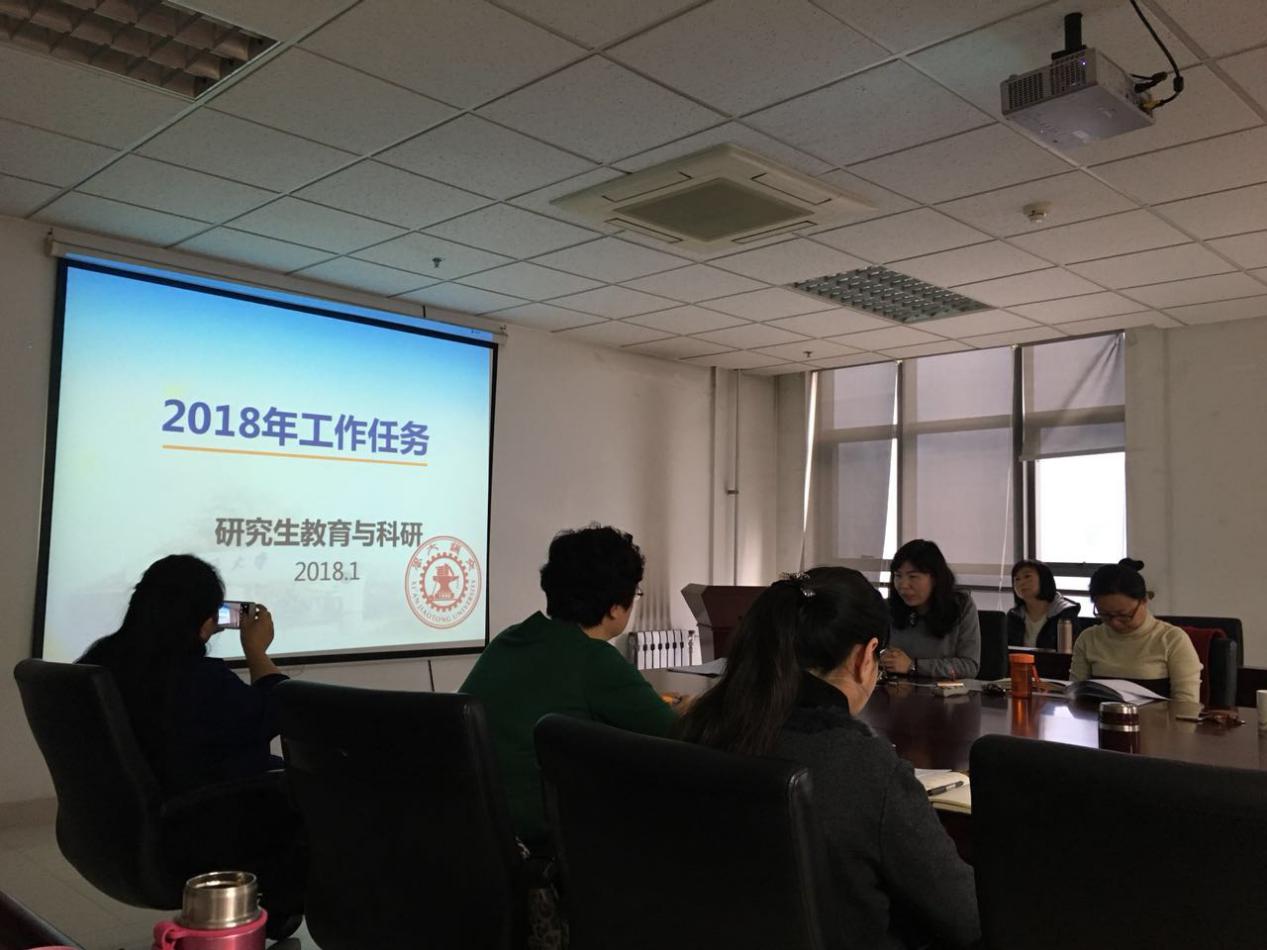 副院长王敏介绍了2018年研究生教育与科研方面的工作任务,包括专业研究生生源质量提升,专业及全校大面积研究生创新模式培养,论文和项目的定量指标。