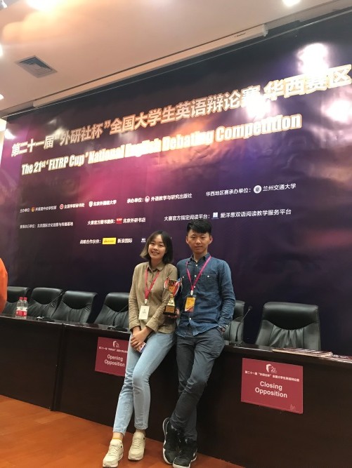 在比赛中,在外语学院刘睿老师的带领下,黄诗锐、张煜成两位辩手代表污污漫
