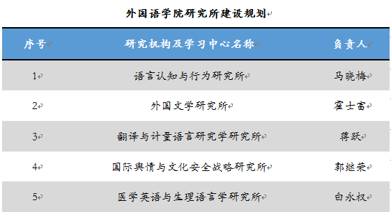 拟在创新港建立语言认知与行为研究所、外国文学研究所、翻译与计量语言学研究所、国际舆情与文化安全战略研究所、医学英语与生理语言学五个研究所。研究平台力求多学科交叉融合,在大力发展现有优势研究方向的同时,发掘培育新的学科增长点,助力“一流学科”学科建设、支撑队伍建设、科学研究、人才培养。