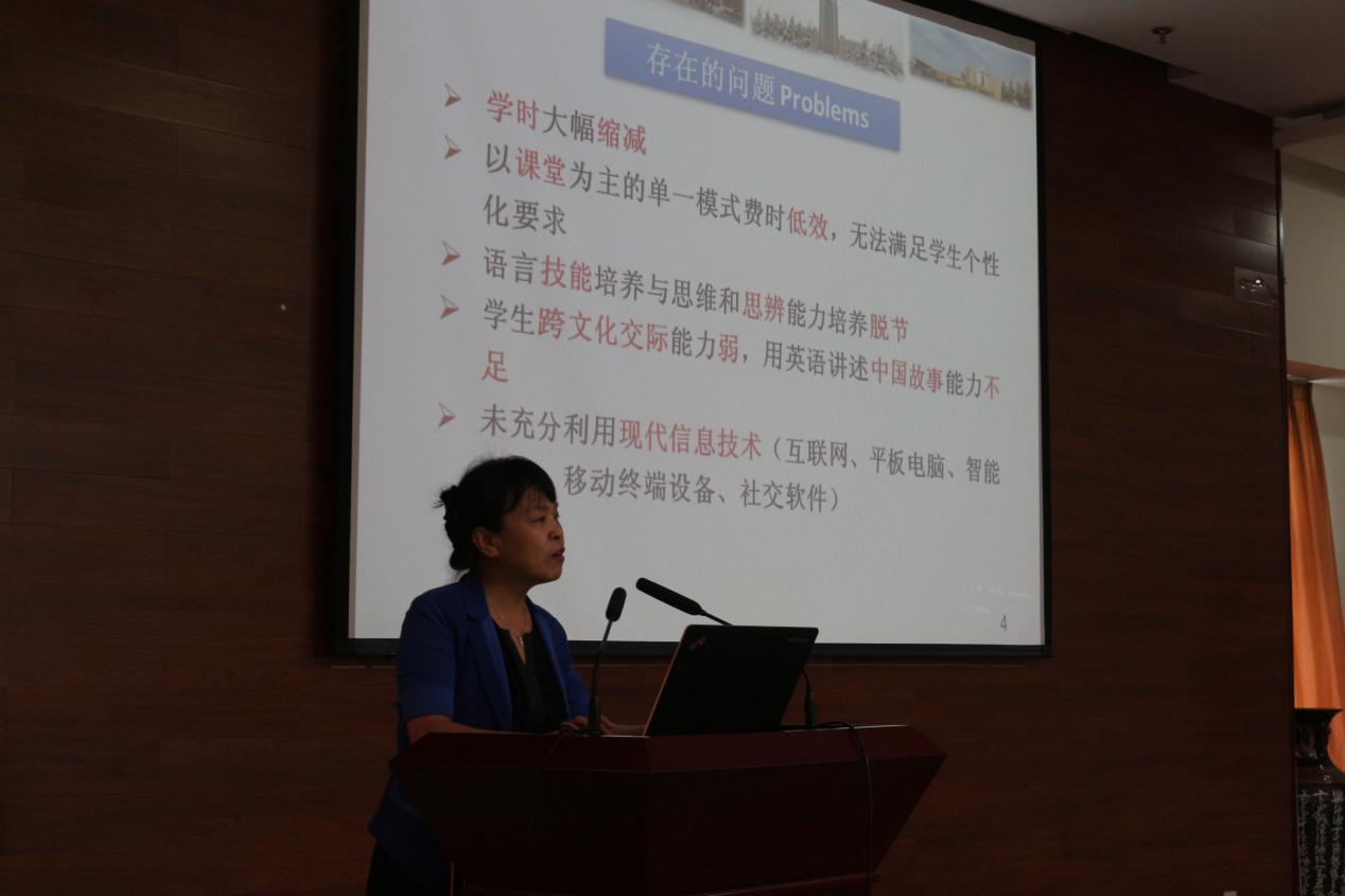 陈向京院长作了题为“大学英语视听说教学现状与基于TED TALKS的课程设计和教学设计”的报告。她阐述了当前视听说教学的现状和存在的问题,指出当前以课堂为主的单一模式费时低效,语言技能培养和思维能力培养脱节,学生跨文化交际能力弱,用英语讲述中国故事能力不强。交大污污漫