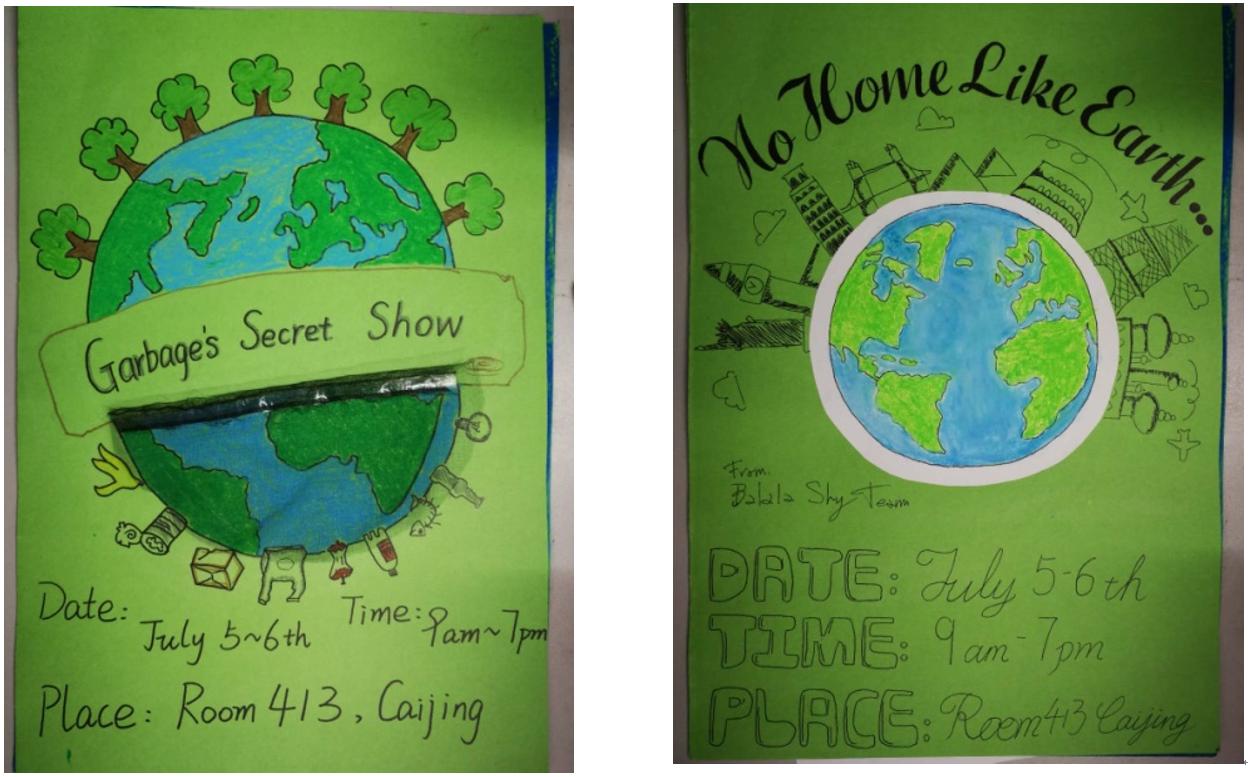 于是同学们分组讨论, 从主题到立意,从选材到成品,同学们积极地讨论着每一种可能性,Lee则时不时加入同学们的交流并给予指导:什么主题能引发人们思考?什么样的表达更贴近主题?通过不断的讨论,同学们最终确立了每组的目标,也在Lee的指导下完成了宣传海报的制作。海报中无一不表达了保护地球,共筑家园的美好愿望。