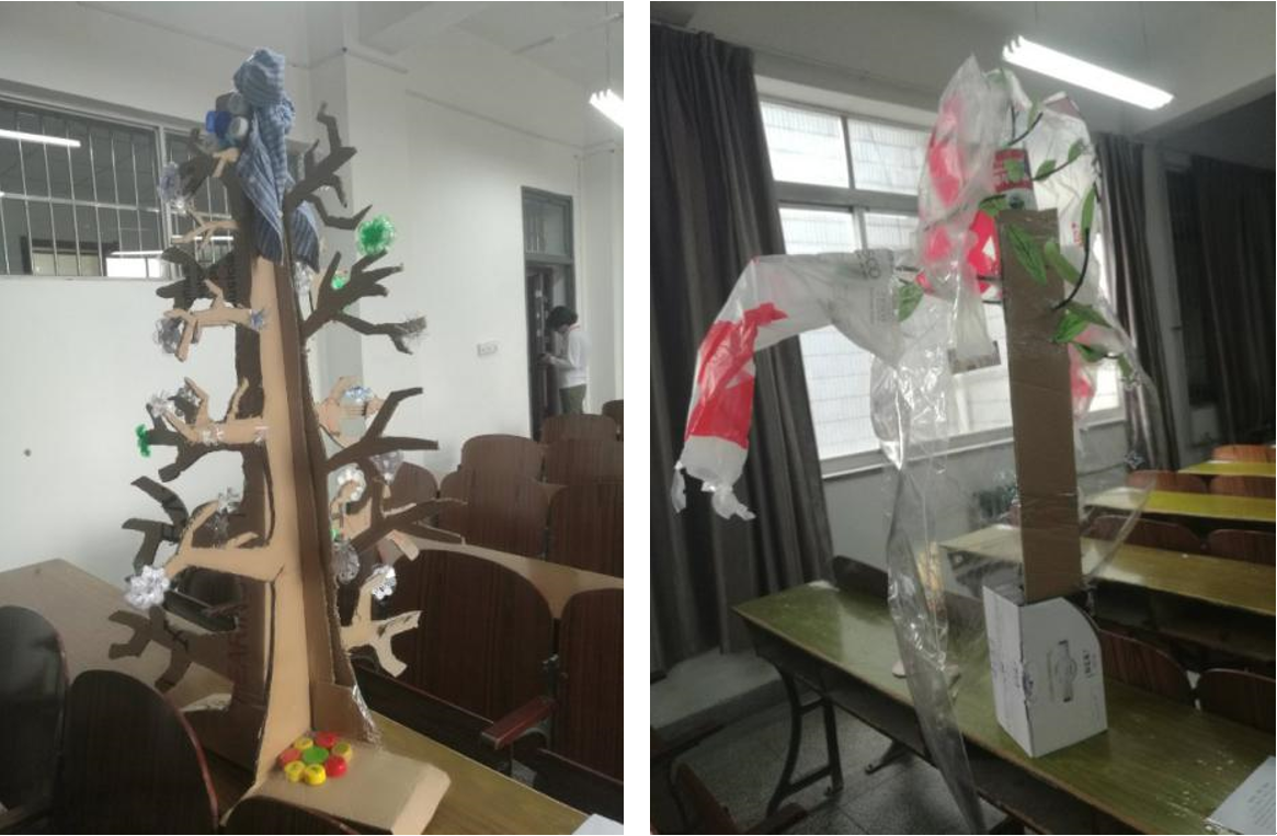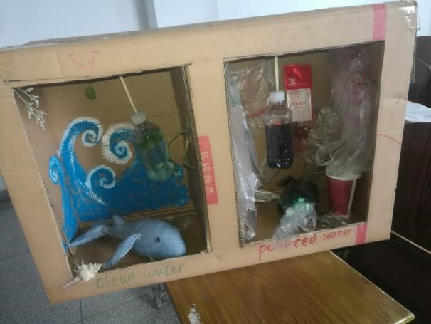 在此之前,同学们已经上了有关环境与艺术的课程。通过丰富的PPT和视频的展示,同学们深切地了解了保护环境的重要性,体会了艺术创造的独特性,还产生了新的思考。在展示中,有三段视频令人印象深刻。它们分别讲述了三个故事——外国中学生们将塑料袋编织成毯子送给流浪的人,为保护环境贡献力量;一个由学生发起的组织经历重重困难,最终让塑料袋消失于柏林;还有一位艺术家利用垃圾来创造精美的装潢,以变废为宝。看过之后,同学们都思考良多,Lee也发出了邀请——让我们像他们一样,为我们的环境做些什么吧!于是,便有了这次的垃圾回收艺术品展。
