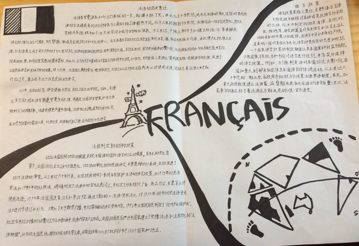 同学们在成果展示中各显其能。通过手绘、手抄、剪贴小报,PPT等方式对“法语的历史”进行了报告。内容包括:法语的起源、法语的历史变迁、现代法语、外来语的影响、法国的语言政策、魁北克的语言政策等。