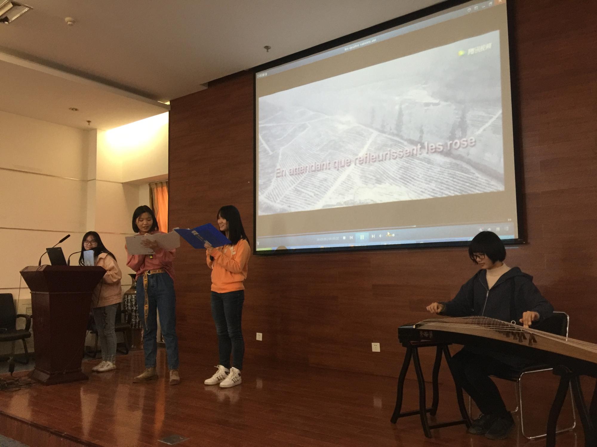 节目精彩纷呈,高潮迭起。一年级全体同学的诗朗诵《人与海》(L’homme et la mer)以及四位女生的古筝·诗·歌表演《四季》(Les saisons),令观众深深投入其中。