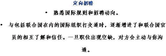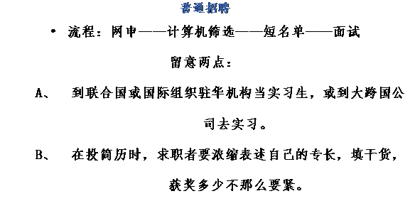 讲座的最后,范重君女士介绍到,想要登上联合国的舞台,一般有两种路径:普通招聘和定向招聘。