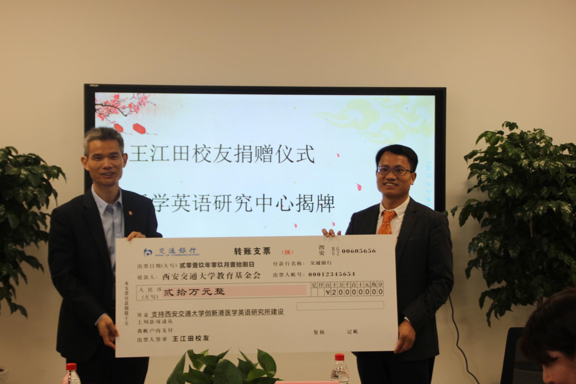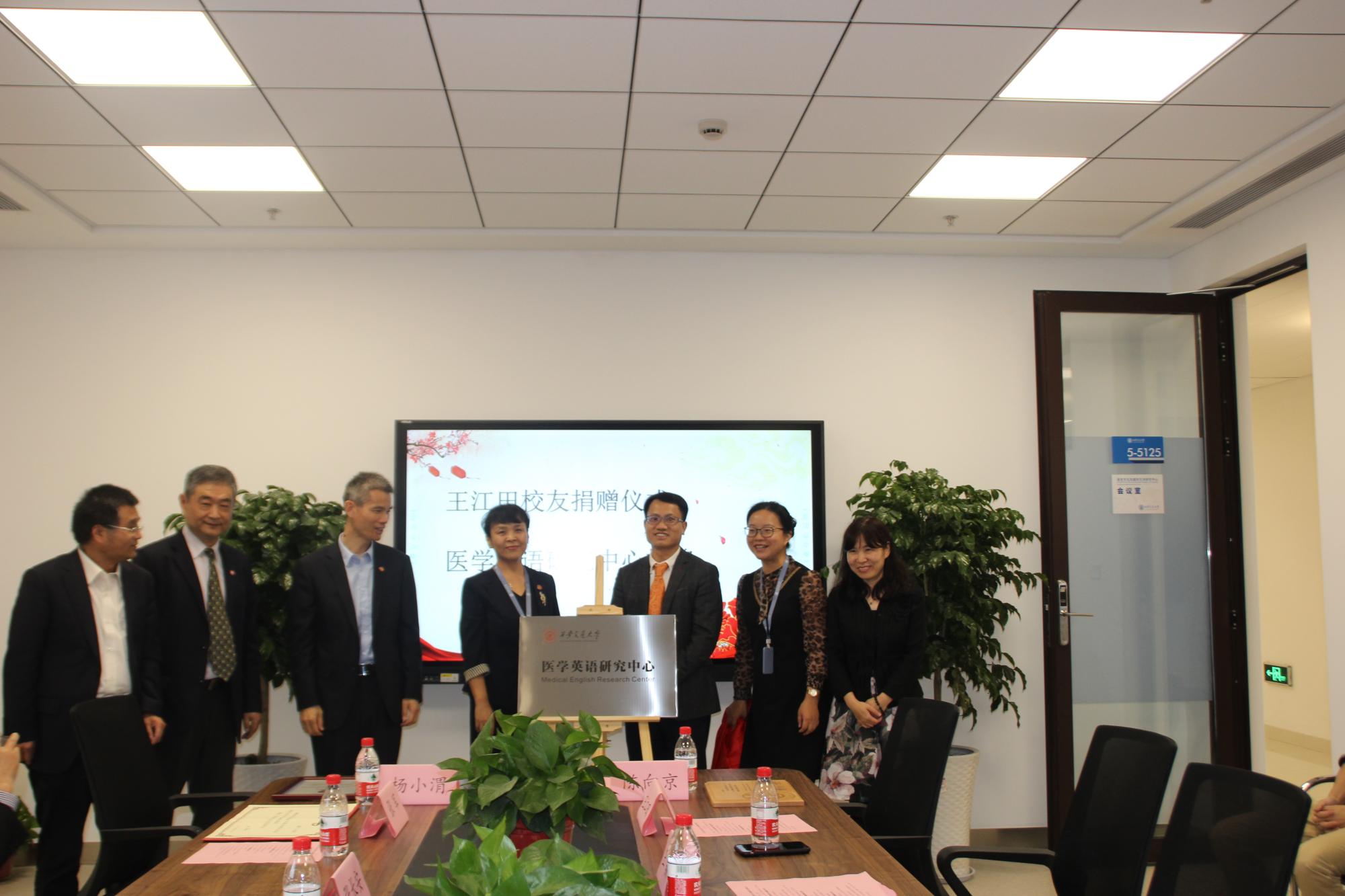 党委书记杨小渭颁发捐赠证书。王江田校友回忆了自己在交大外院医学英语专业的求学经历,并十分感激母校对自己的培养,希望中心发展得越来越好。王江田校友和中心领导共同为医学英语研究中心揭牌,陈向京主任就中心日后的建设规划做了展望,希望中心在保持医学英语一流学科地位的同时,发展新的学科增长点,努力向世界一流学科迈进!