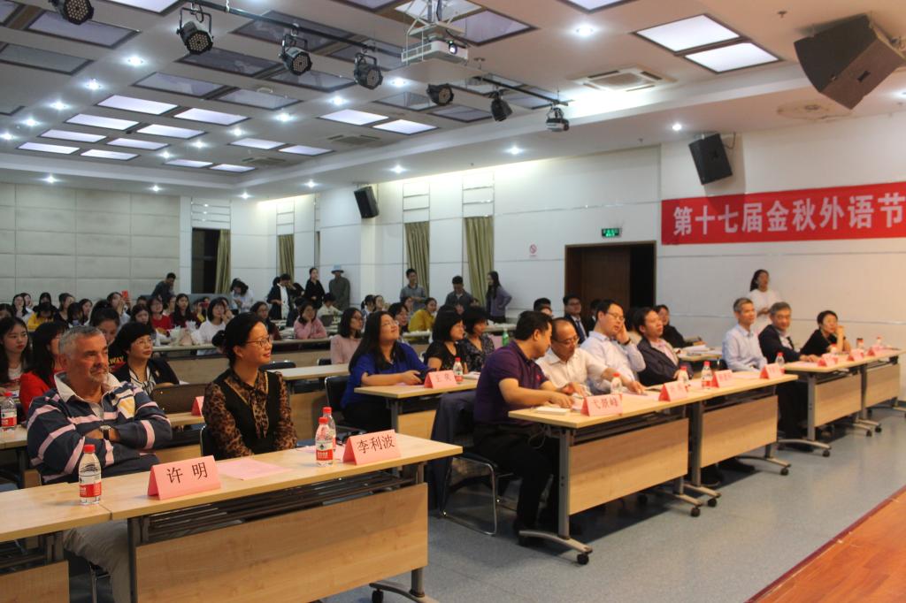 第十七届金秋外语节开幕式暨英语演讲比赛于兴庆校区外文楼1001报告厅隆重开幕。彭康书院院务主任叶明,学工部副部长李新安,教务处副处长杨建科,学校工会副主席弋景峰,团委副书记李利波,污污漫