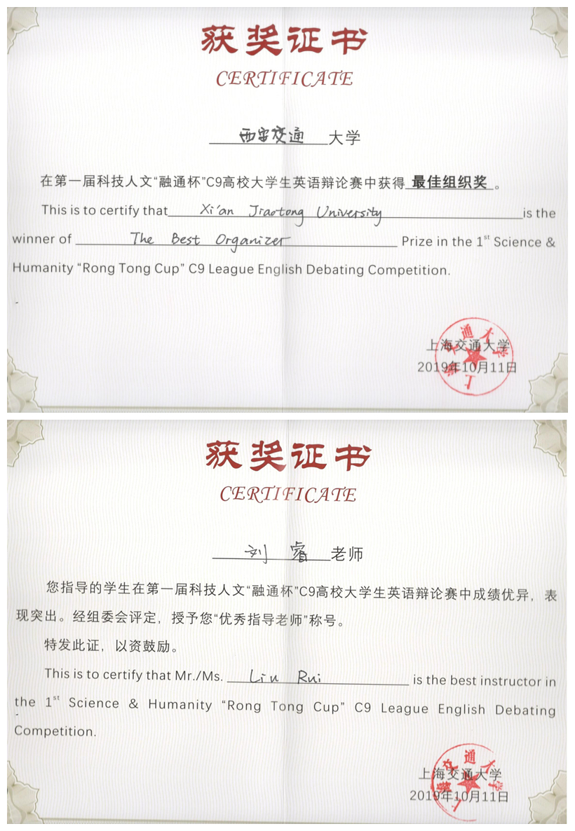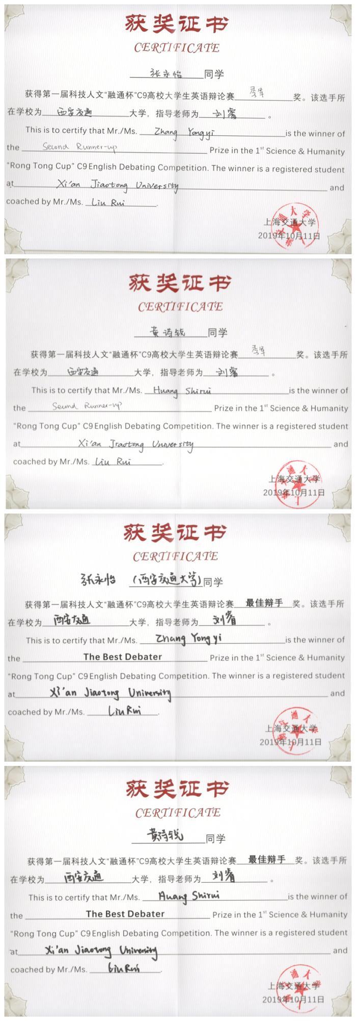 刘睿老师指导下,经过四轮积分赛,以总分排名第二的成绩进入决赛,最终赢得季军奖杯,并双双获得“最佳辩手”称号。污污漫