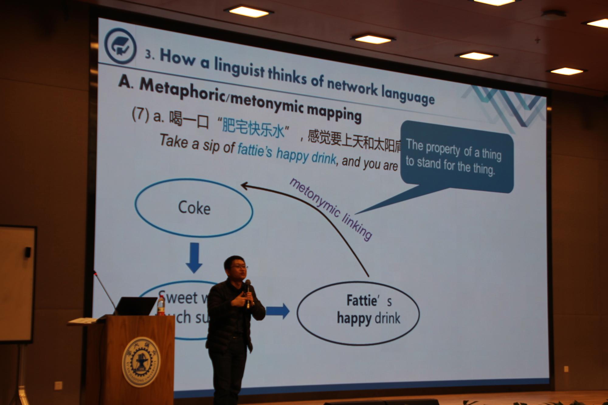 庞加光教授将日常生活中出现的网络新词与语言学联系起来,引发语言创新与认知的思考。他从网络语言、语言与认知、网络语言认知机制及本质四个方面进行阐述。庞加光教授指出,网络语言是网民在互联网平台互相交流使用的语言,具有创造性、新奇、受瞩目、流行的特点。人们对语言的理解不止停留表明概念,还与脑海中、意识层面活动产物相关。他认为,基于事物相似性,通过隐喻、转喻等修辞方法,网络新词由此产生,例如“不能浪费时间”,暗喻时间即金钱。并举例“种草”“柠檬精”“单身狗”等词中英表达,指出字面与比喻义存在隐喻连接、转喻连接关系,提出网络语言的解释要通过源域理解目标域,进行概念整合与虚拟。
