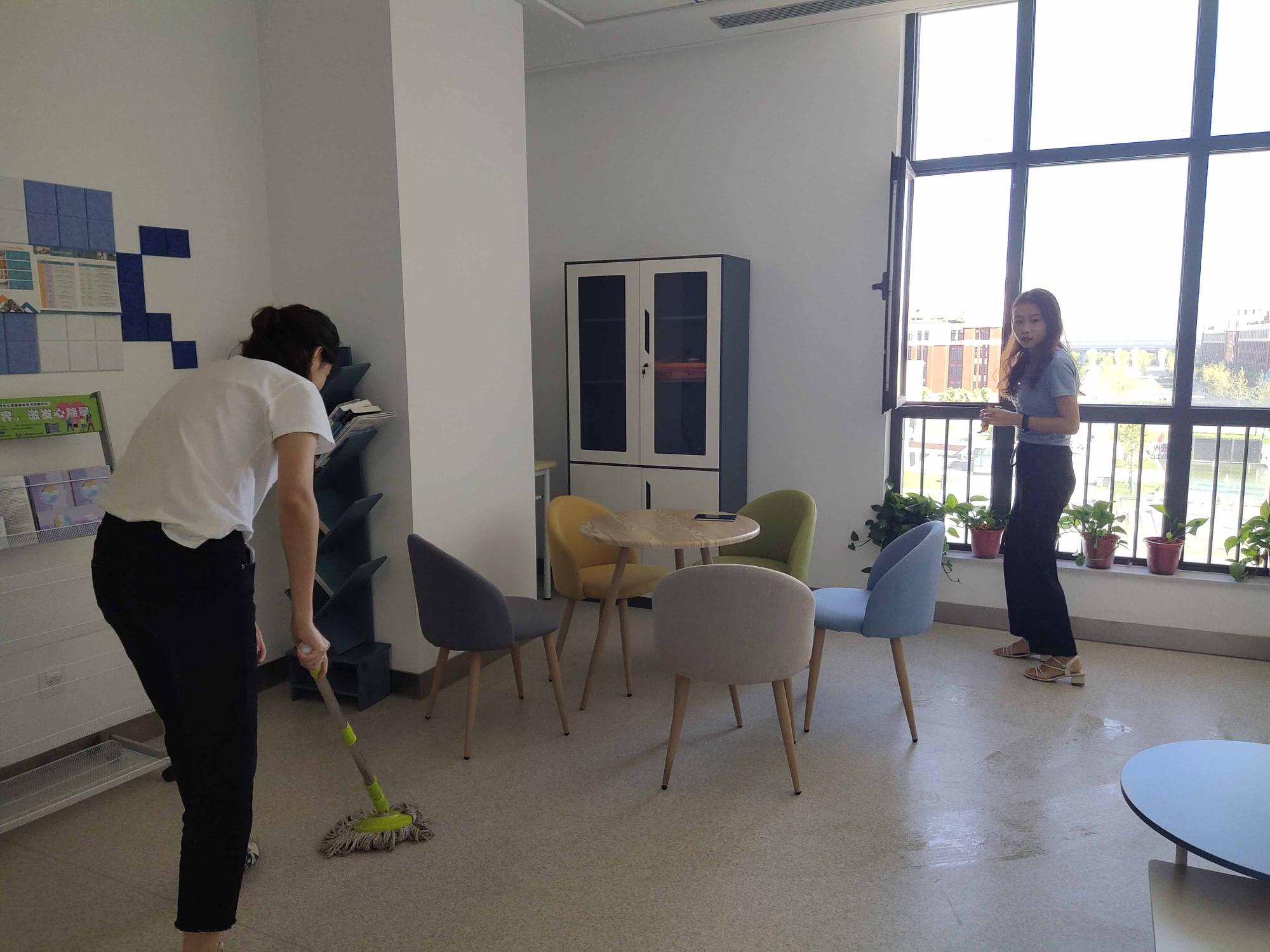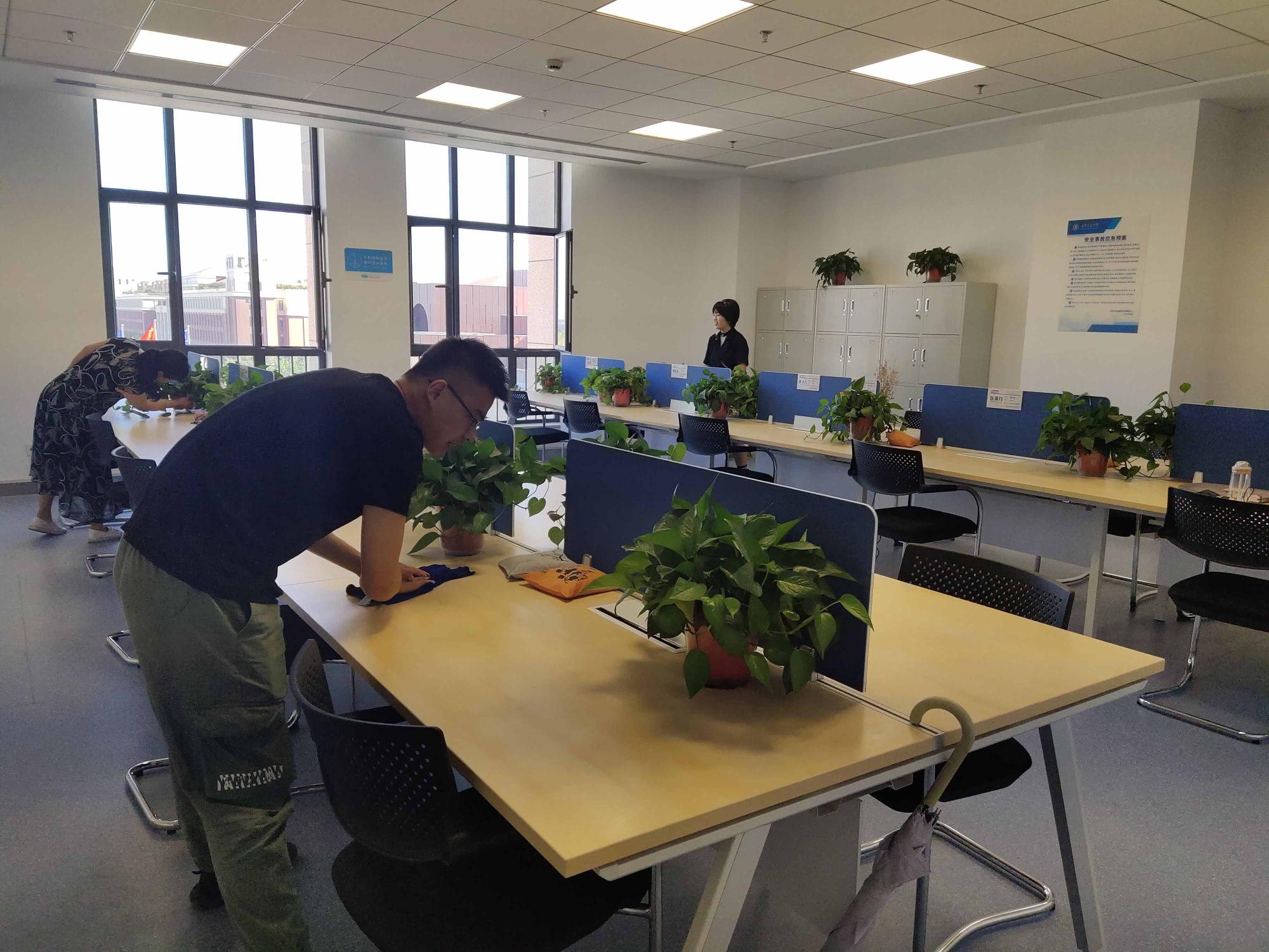党委副书记许明与研究生辅导员康晋楠组织“三新班”成员打扫学生工位,为研究生在创新港未来的学习与生活,创造一个窗明几净的舒心环境。