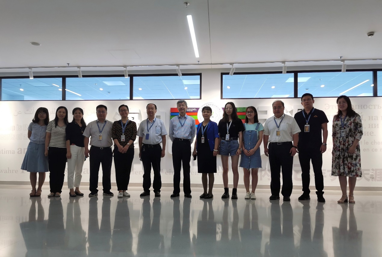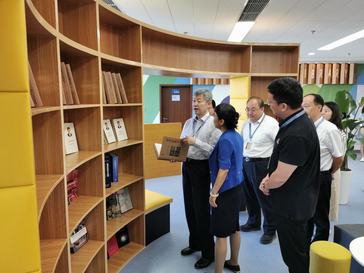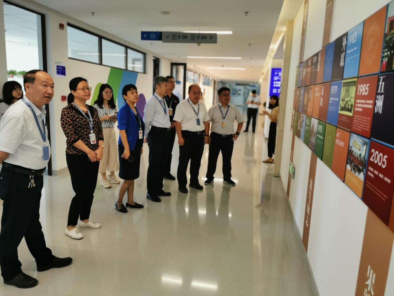张迈曾书记一行参观了语言文化及国际交流研究中心活动大厅、不言书屋、文化展示墙、教师办公室、同声传译室以及“一带一路”研究中心、非洲研究中心、校企合作基地/医学外语研究中心等平台建设情况。中心主任陈向京介绍了平台建设和“科创月”筹备情况,重点介绍了平台设计背后的文化内涵。