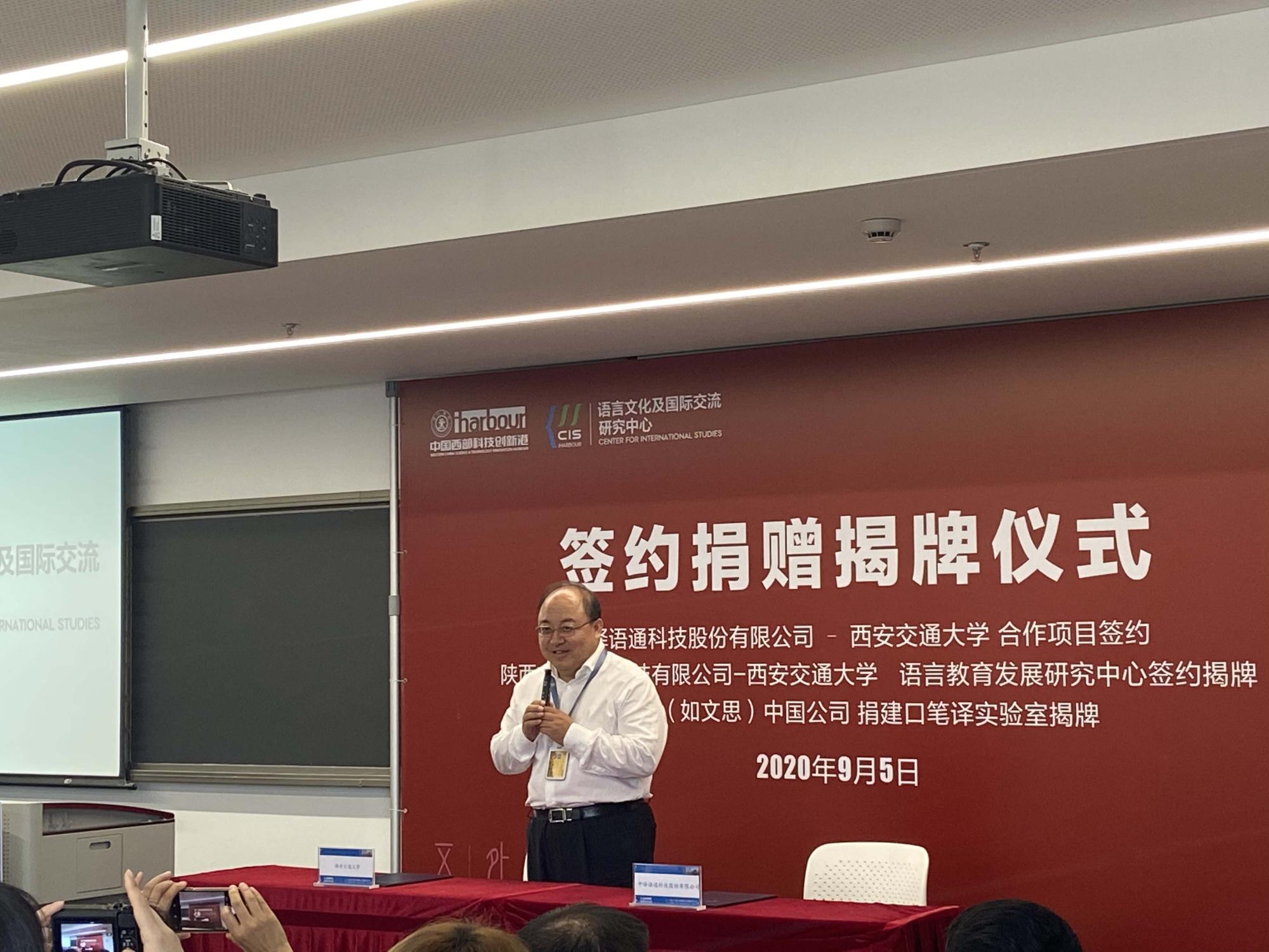 院长陈向京代表语言文化及国际交流研究中心,分别与中译语通科技股份有限公司、陕文投集团•文投教育公司的代表签署合作协议。之后,依次举行语言教育发展研究中心、口笔译实验室揭牌及捐赠仪式。