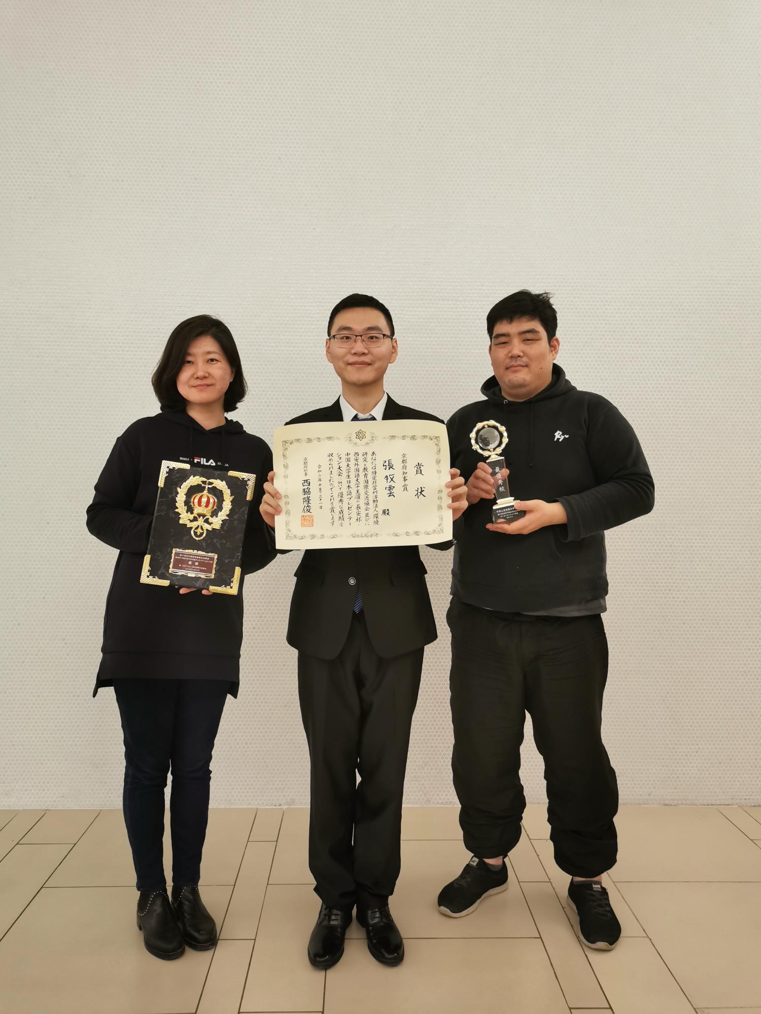 2017级张牧云同学在日本交换留学期间,参加了灾害救援志愿者活动,以自己的切身体会,突出表达了在灾害面前无国界,互相关爱才是社会的真正价值所在的主旨思想,最终以总分第一的成绩勇夺本次比赛特等奖,并获京都府知事奖,受邀将于2021年5月赴日本开展交流。