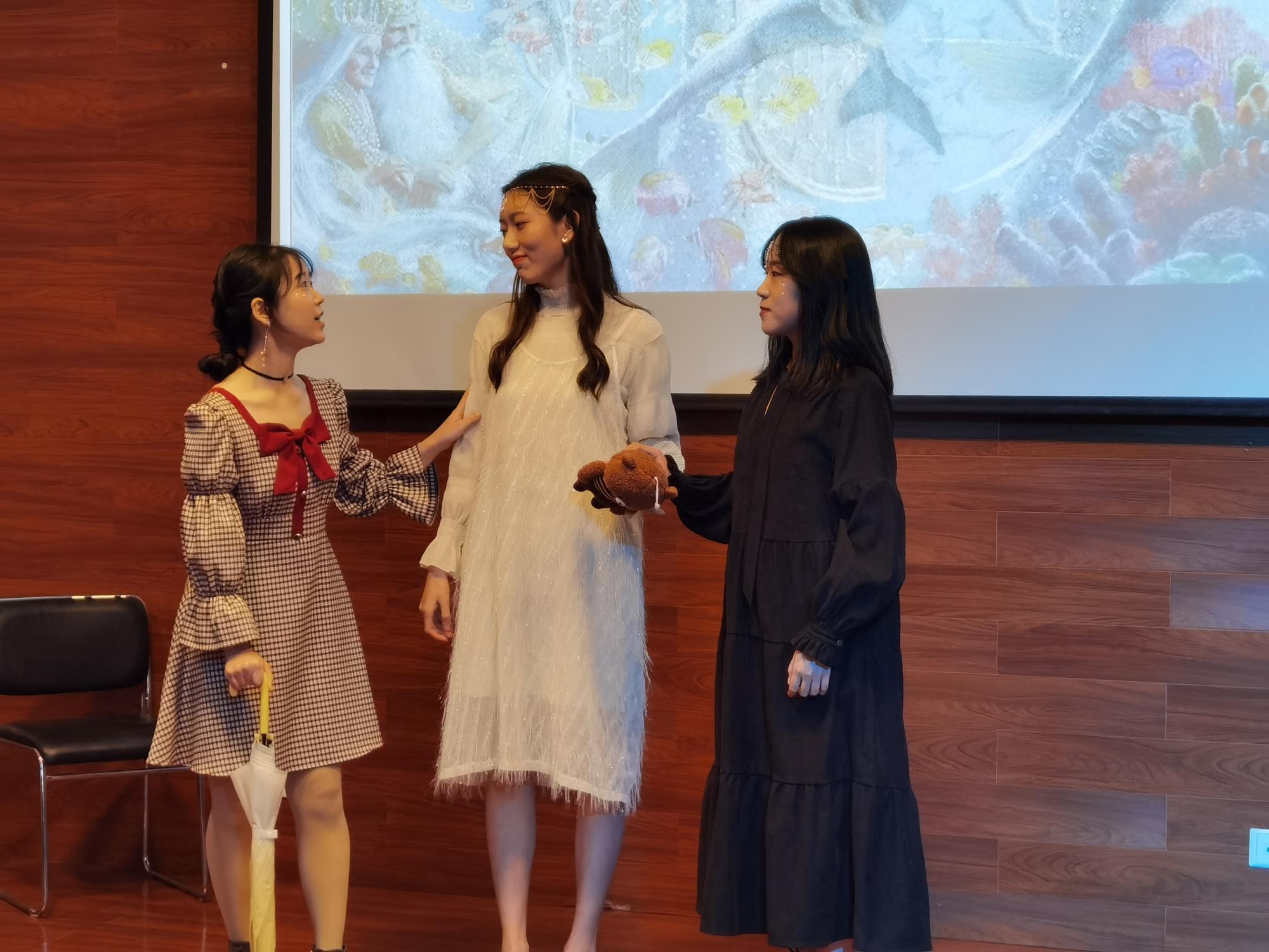第一场话剧是英法81班带来的《小美人鱼》(La petit Sirène),演员们精心准备PPT背景、服装道具,精致的妆容,他们大方的演技赢得台下评委和观众阵阵欢声笑语。第二场话剧是一出自编的小品——《网课》(Cour en Ligne),演出者们分别扮演学生、老师和家长,表演了疫情期间线上上课的众态,自我调侃,很有代入感。最后一个话剧表演《小红帽》,(Le Petit Chaperon Rouge)表演者选择忠于原著,唤醒了大家童年沉睡的记忆。