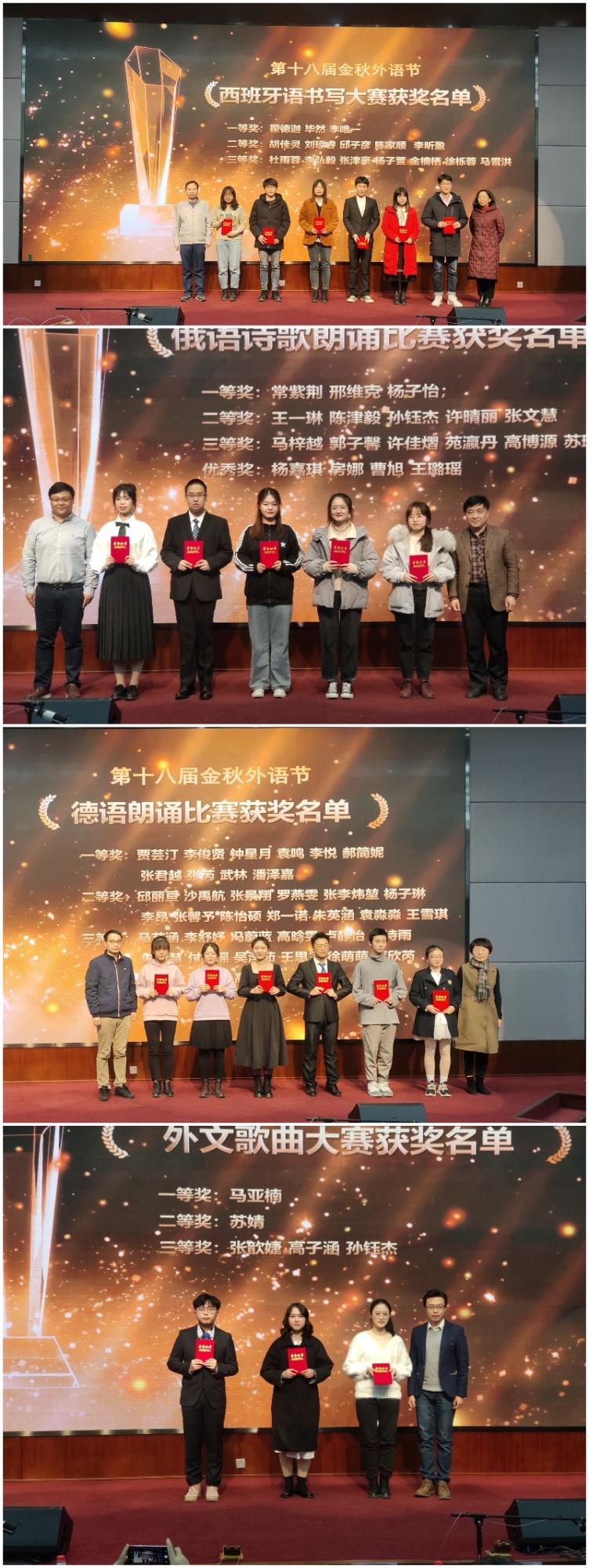 随后,举行了颁奖仪式,获奖选手分别参加了英语演讲比赛、英语辩论赛、英语话剧表演大赛,法语风采大赛、法语演讲比赛,日语配音大赛、日语朗读大赛、日语口译大赛、日语风采大赛,西班牙语朗诵大赛、西班牙语书写大赛,德语朗诵大赛,俄语诗歌朗诵比赛,外文歌曲大赛等。