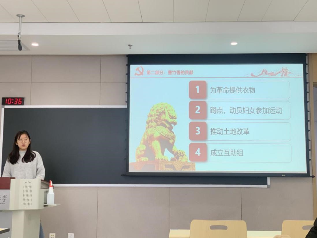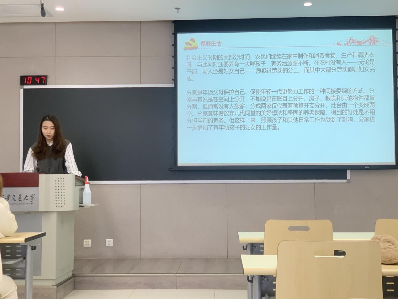 紧接着,郭顺鑫同学带来第三章“寡妇”的分享。本章以50年代初的全国土改运动和互助组的成立为背景,检视国家通过指派干部到乡村去长期居住以发展地方村领导所做出的尝试。本章记录的故事以曹竹香从一个普通农村妇女成长为妇女领导的故事为主线,介绍了她为革命提供衣物、蹲点动员妇女参加活动、推动土地改革、成立互助组的贡献。郭同学总结了了妇女干部在国家发展中的重要作用。