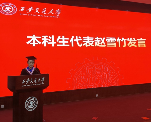 在学生代表发言环节中,英德71班的赵雪竹同学作为本科生代表进行了精彩的发言。她首先对学院领导、老师的悉心教导和辛勤培育表达了深深的感激,总结了四年来充实而难忘的大学生活,并表示在今后的人生道路上,始终牢记校训精神,严于律己,披荆斩棘!
